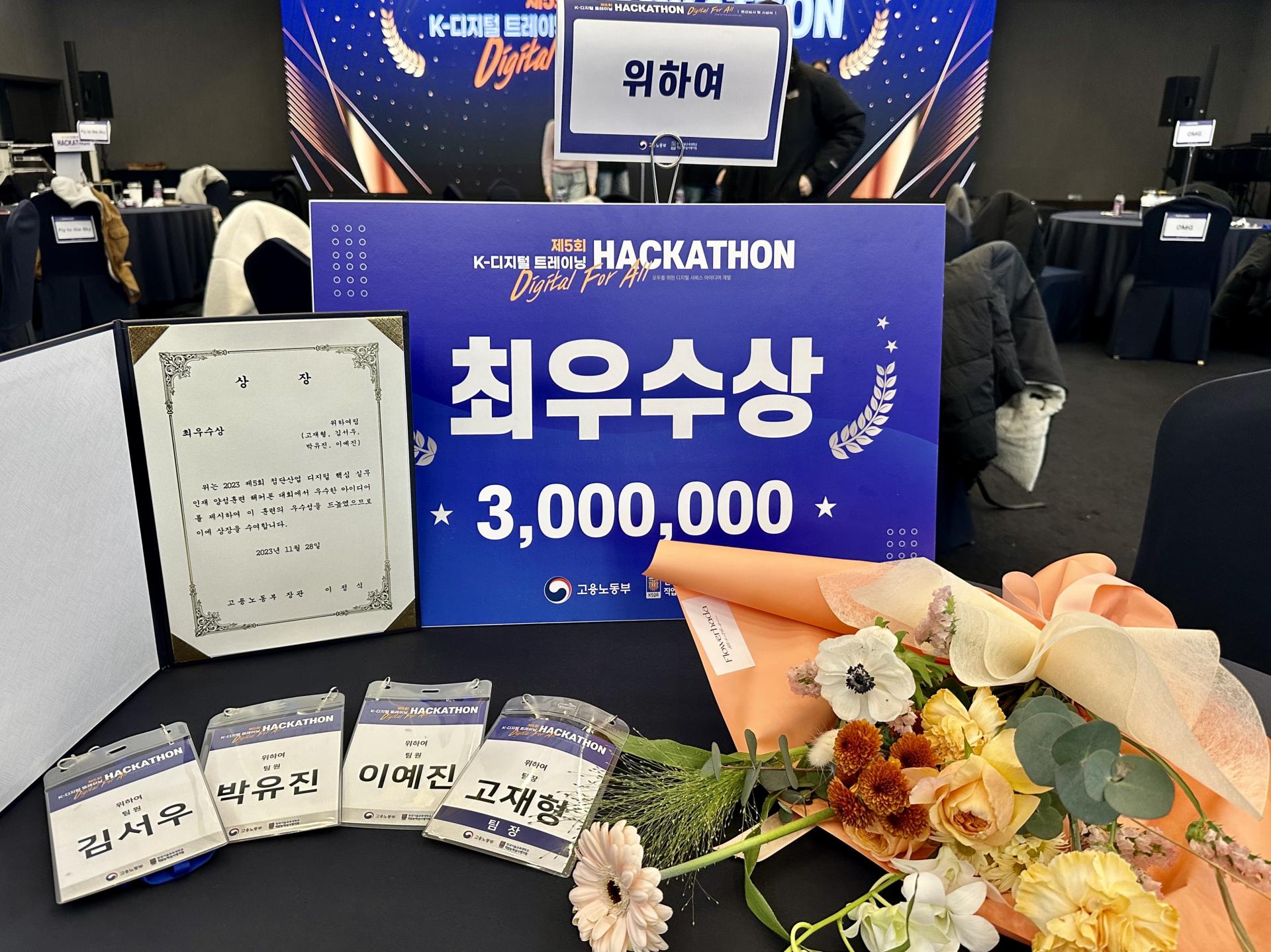 솔데스크 백승찬 강사 팀 “위하여”는 최우수상을 수상하여 유종의 미를 남겼다. “본선진출만으로도 만족한데, 최우수상까지 수상해서 너무 기쁩니다. K-디지털 트레이닝 해커톤 수상이 고용노동부 장관상이니만큼 완벽한 결과이자 만족스러운 대회였습니다“ 라는 소감을 남겼다.