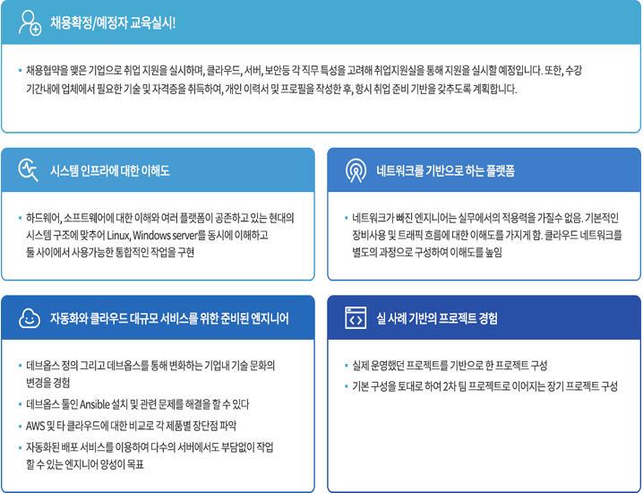 • 채용협약을 맺은 기업으로 취업 지원을 실시하며, 클라우드, 서버, 보안 등 각 직무 특성을 고려해, 취업지원실을 통한 지원을 실시합니다.