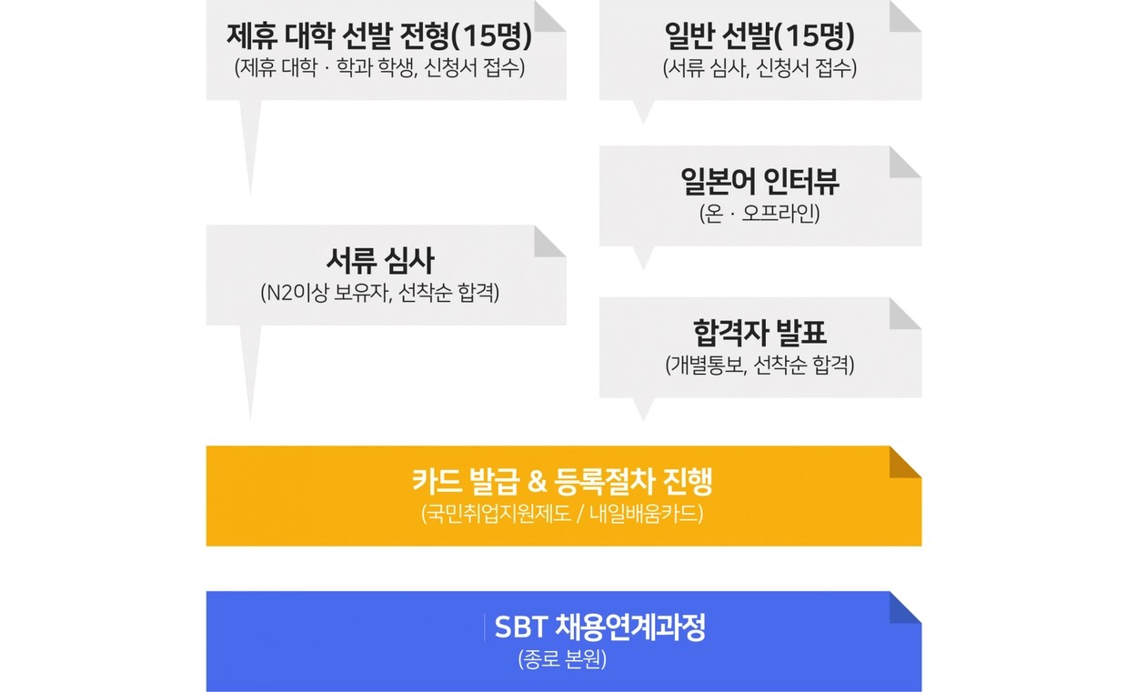 모집은 어떻게 진행되나요? | 모집절차 • SBT채용연계과정 일반 선발은 솔데스크 해외사업부에서 일본어 인터뷰를 통해 합격순으로 선착순 모집하고 있습니다. • 신청서 접수 순서대로 인터뷰를 진행합니다.