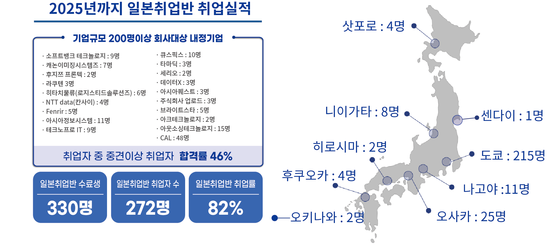 • 수료생 일본취업처: 소프트뱅크테크놀로지, 캐논이미징시스템. 후지쯔. 라쿠텐. 히타치물류, CTC그룹, 후지쯔, 아웃소싱테크놀로지, 유메테크놀로지, 칼주식회사, 일본IT칸타스쿨, 세라쿠, 아시아정보시스템, 소덱, 도쿄어플리케이션, Itbook GROUP, 글로벌로드, GIX, 젤리피쉬 등등